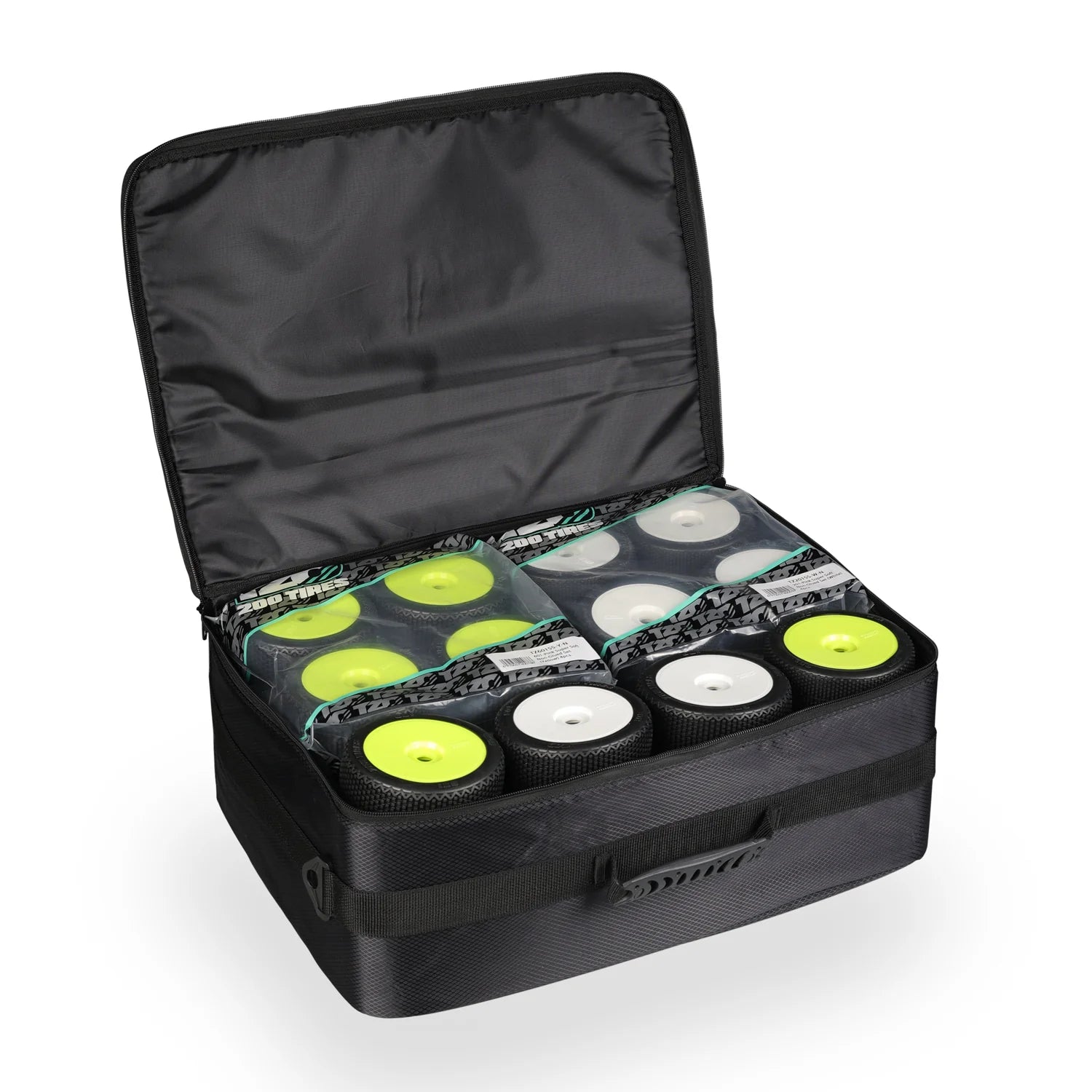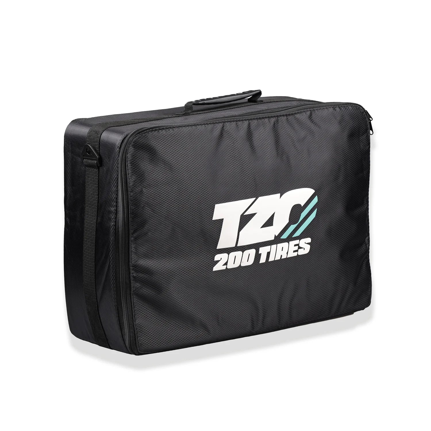 Constructed from a stylish black diamond-cut textile with reinforced webbing and hard plastic side panels, this bag combines a premium look with professional-grade protection. A smooth-operating YKK zipper and soft plastic carry handle make it easy to transport your tire inventory wherever the race takes you.